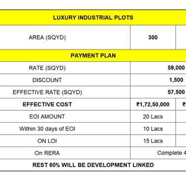 If you pay ₹30 Lakh within a month, the rate reduces to ₹55,000 per Sq. Yd, providing significant savings for early investors.